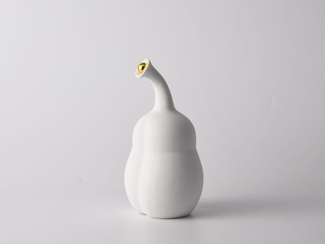 Тази минималистична скулптура от керамичен модерен декор с бяла кратуна се предлага в два размера и е особено подходяща като постмодерен поглед върху лекия лукс и други основни битови неща. Като цяло, старши дизайнери ще използват този продукт, когато излезе схемата за интериорен дизайн.